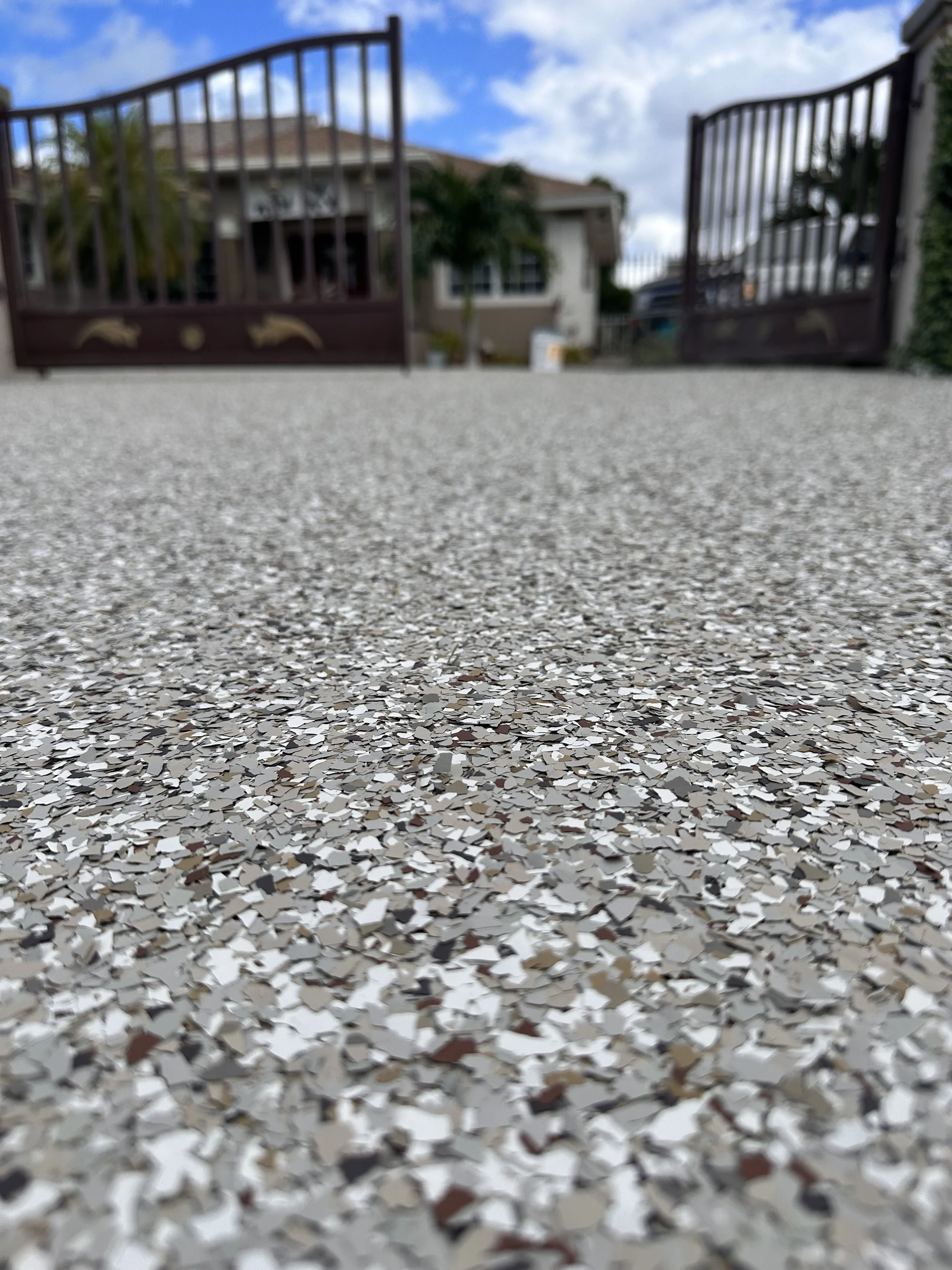 Exterior epoxy floors are designed to last 10-15 years or more, even in harsh weather conditions. The exterior flooring remains durable, resistant to wear, cracking, and fading, providing lasting beauty and performance for outdoor spaces like walkways and pool decks.